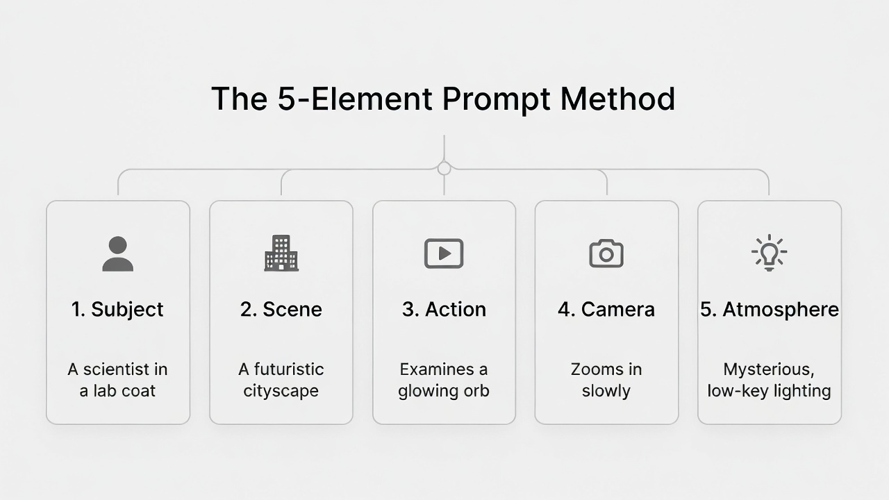 - The 5 elements are: subject, scene, action, camera, and atmosphere.