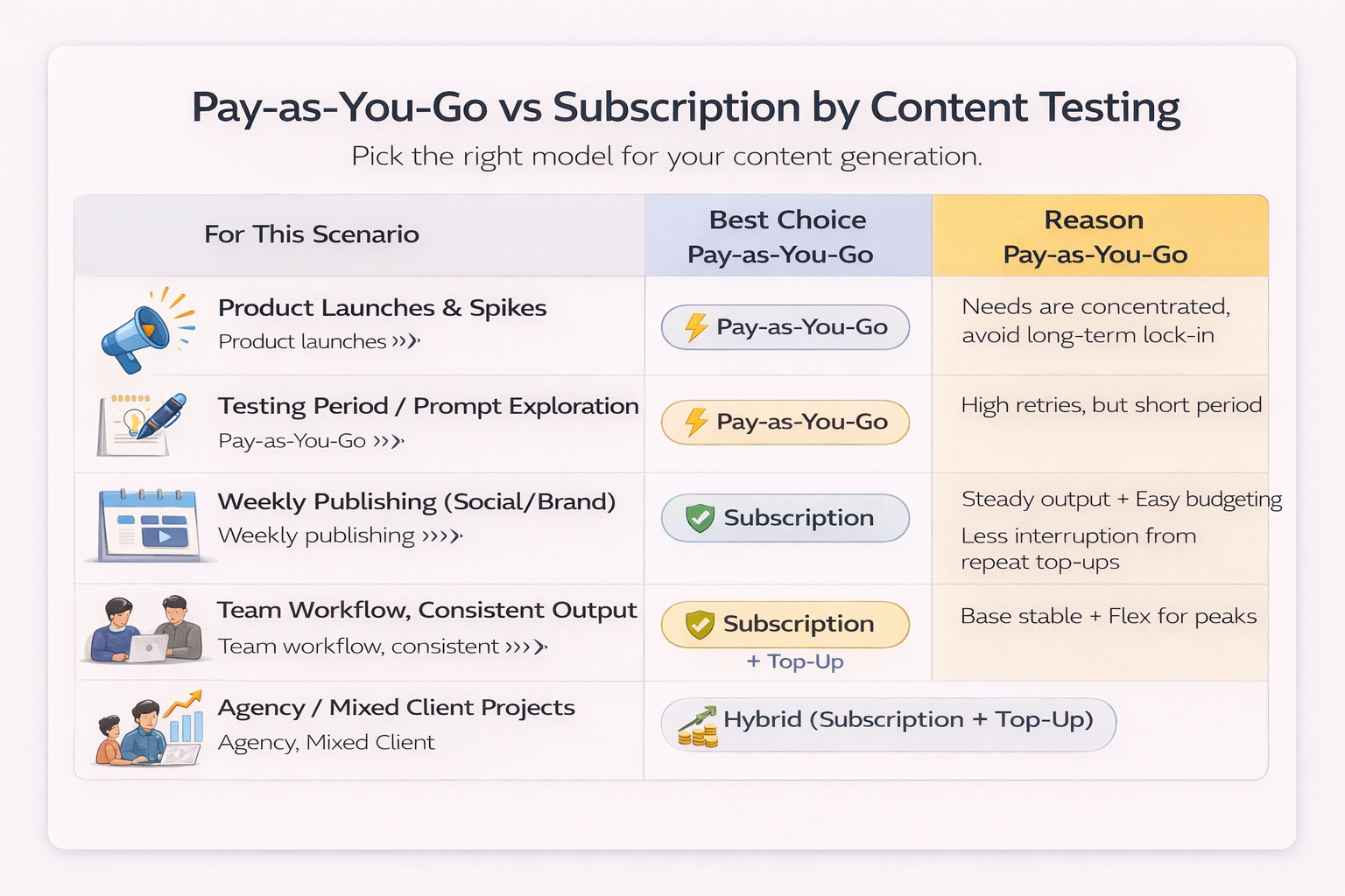 | Pay-as-You-Go | Flexible or project-based work | Uneven usage, campaign spikes | Unit cost can feel high at scale |